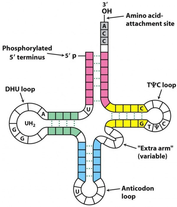 প্রতিটি কোষে প্রায় ৩১-৪২ ধরণের tRna থাকে। ক্লোভার লিফ মডেল অনুসারে প্রতিটি tRNA এক সূত্রক এবং লম্বা চেইনের মতো থাকে কিন্তু পরবর্তীতে তা ভাঁজ হয়ে যায় এবং বিভিন্ন জোড়ার সৃষ্টি হয়ে প্রতিটি tRNA তে একাধিক ফাঁস তৈরি হয়। যেমনঃ T-ফাঁস বা D- ফাঁস। সবচেয়ে গুরুত্বপূর্ণ ফাঁস হলো অ্যান্টিকোডন ফাঁস যা mRNA এর মুখোমুখি বসে যেতে পারে। tRna ৩’ প্রান্ত এক সূত্রক এবং সর্বদাই CCA ধারায় বেস সজ্জিত থাকে। এখানে অ্যামিনো এসিড সংযুক্ত হয়। একে বলা হয় অ্যামিনো এসিড সাইট।